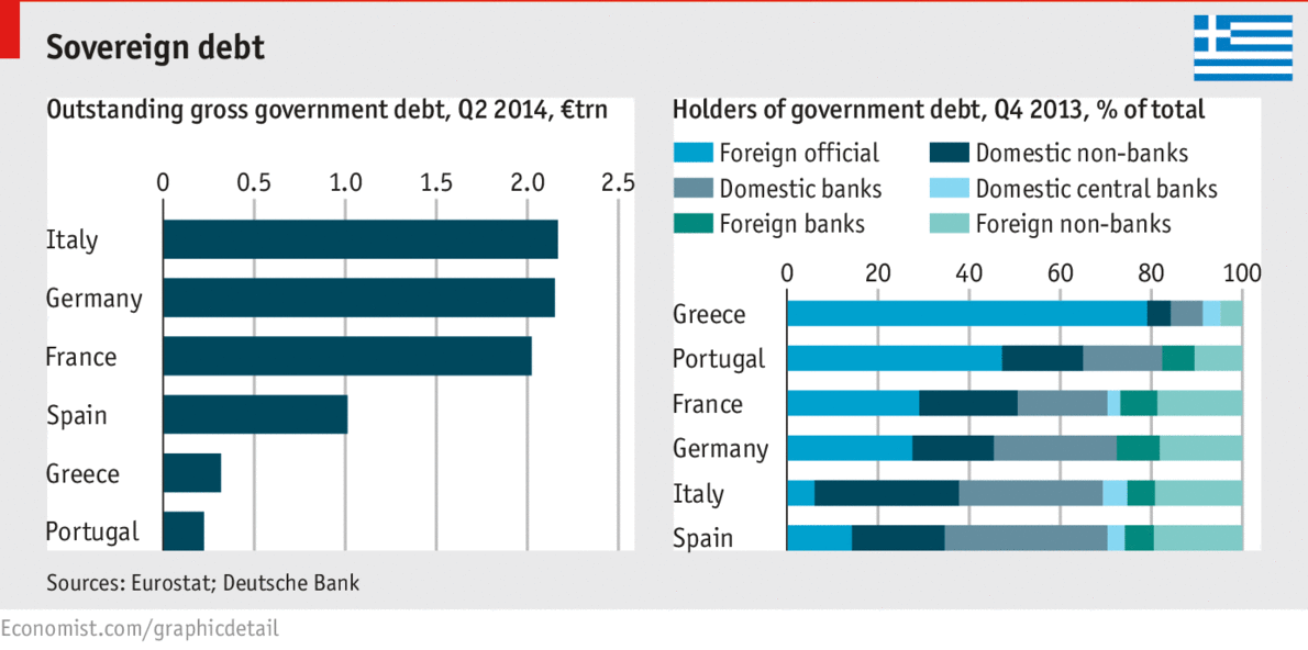 V najboljši situaciji je Italija, ki ima dve tretjini javnega dolga do domačih upnikov, med tujimi upniki pa je le malo uradnih institucij (okrog 5% celotnega dolga). V podobni situaciji je Španija. Obe pa sta v relativno boljšem položaju kot Nemčija, ki ima precej dolga do tujih uradnih institucij, ki iščejo zatočišče v nemških obveznicah. Seveda so stroški servisiranja dolga (obresti) za Nemčijo nižji, toda v primeru razpada evrskega območja, bo tudi za Nemčijo pomembno, koliko njenega javnega dolga je v rokah njene matične centralne banke.