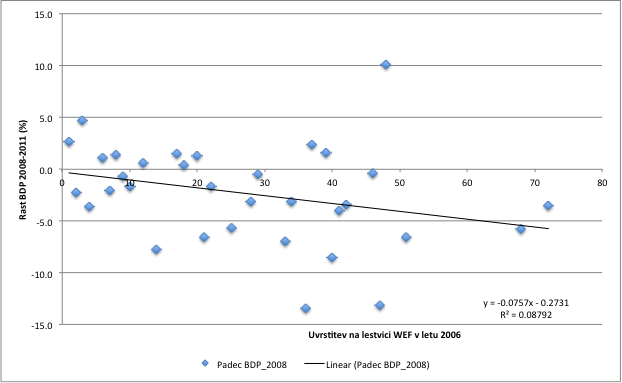 Slika 1: Rast BDP 2008-2011 (%) glede na uvrstitev na lestvici WEF v letu 2006 v državah EU in OECD