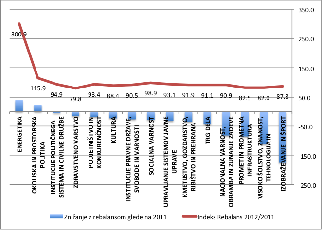 Slika: Zmanjšanje javnih izdatkov v rebalansu proračuna za 2012 (mio evrov)