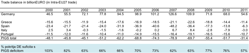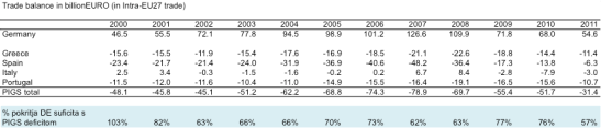 Hitra tabela, ki kaže, da (v notranji trgovini med članicami EU) 4 PIGS države s svojim trgovinskim deficitom v zadnjih letih pokrivajo 3/4 nemškega trgovinskega presežka (podatki za 2011 še niso popolni).