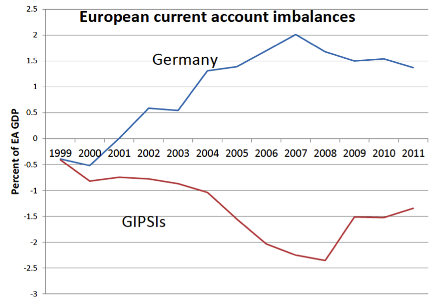 To usodno povezanost lepo nakazuje spodnji graf, ki kaže, da Nemčija potrebuje preostali del Evrope za svoj suficit v trgovinski bilanci. Ta nemški suficit je zrcalna slika deficita šibkejših članic evro območja (lahko jih imenujete PIIGS ali bolj politično korektno GIPSIs).