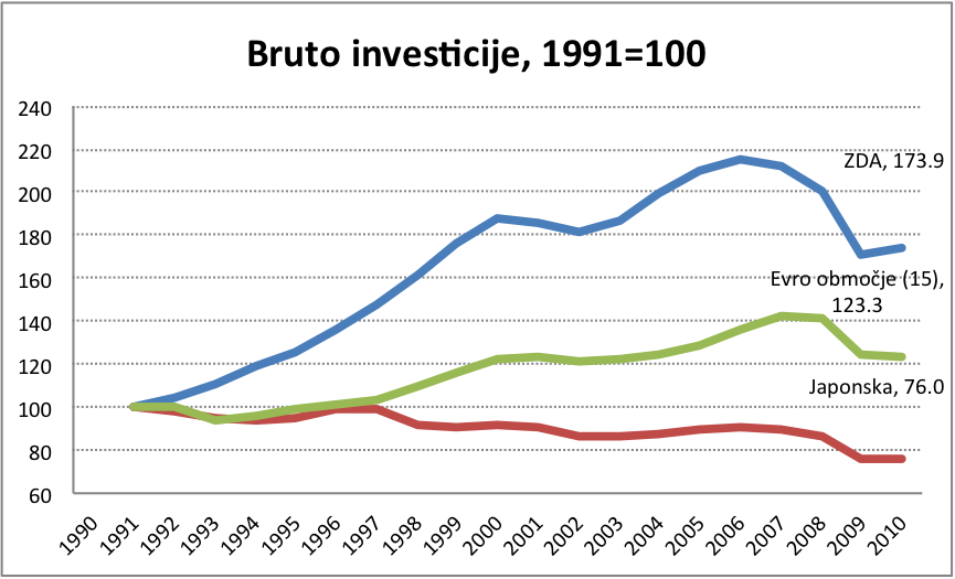 Razlog je v investicijah. Japonsko gospodarstvo je nehalo investirati. Bruto investicije so se celo zmanjšale za četrtino, medtem ko so v evro območju za četrtino zrasle, v ZDA pa celo za dobrih 70%.
