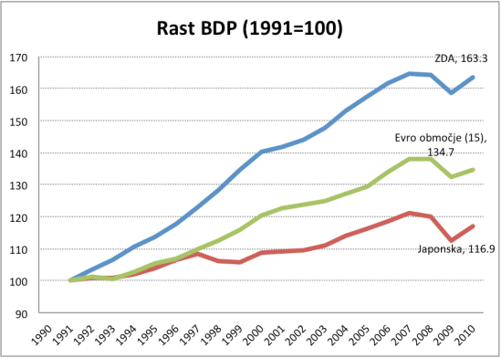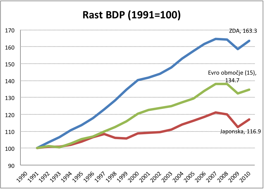 Gospodarstvo ZDA je v obdobju 20 let kumulativno zraslo za 63%, v evro območju za 35%, na Japonskem pa le za 17%.