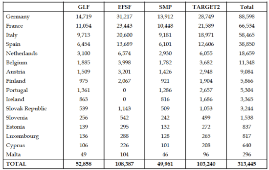 Celotna javna izpostavljenost držav evro območja do Grčije pa po oceni CEPS znaša dobrih €313 milijard. Od tega odpade na paket bilateralne pomoči (GLF) €53 mlr., na mehanizem EFSF €108 mlr., €103 mlr. odpade na terjatve ECB do grške centralne banke prek sistema Target 2, €50 mlr. pa odpade na odkupe grških obveznic, ki jih je v okviru programa SMP opravila ECB (glej tabelo 1).