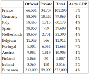 CEPS je seštel izpostavljenost držav evroobmočja na podlagi različnih javnih mehanizmov in terjatev privatnega sektorja. Terjatve bank držav iz evro območja so konec leta 2011 znašale €90.5 mlr. in so se glede na leto 2009 zmanjšale za več kot polovico. Pri tem je zanimivo, da so svojo izpostavljenost najbolj zmanjšale nemške banke (za 70%), francoske pa le za 44%. Medtem ko so nemške banke svoj delež v evropski izpostavljenosti do grških bank zmanjšale iz 25% na 15%, pa so ga francoske banke povečale s 40% na 50%, saj so v vmesnem času celo v celoti prevzele nekatere grške banke.