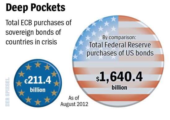 Hja, verjetno bi moral pogledati tudi detaljne ukrepe FED in njihove posege na trgu ter ju primerjati. Oboji se močno gredo QE (quantitative easing). Kot veš, je Bernanke pred dvema letoma v govoru v spomin na Miltona Friedmana povedal, da ne bodo ponovili napake ameriške monetarne politike iz 1930. let, ko je – po Friedmanu – zagotavljala premalo likvidnosti in s tem bila po njegovem kriva za poglobitev depresije.