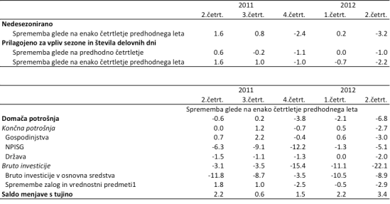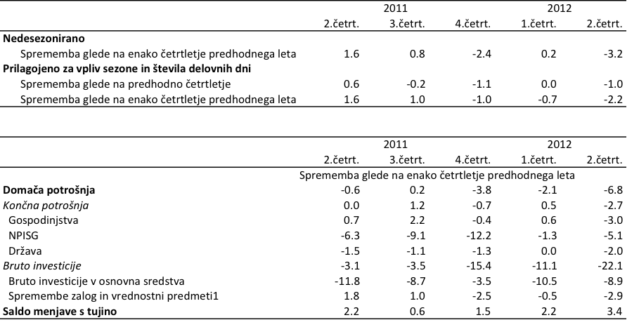Po podatkih SURS se gospodarska recesija v Sloveniji poglablja, saj BDP v primerjavi z enakim obdobjem lani upada že tretje četrtletje zapored. Medtem ko je v lanskem zadnjem četrtletju upadel za okroglo 1%, v prvem četrtletju letos za 0.7%, pa je v drugem četrtletju upadel že za 2.2% (po podatkih, ki ne upoštevajo sezonske komponente in niso prilagojeni za število delovnih dni, pa kar za 3.2%). V prvi polovici leta je na letni ravni BDP upadel že za 1.6%. Razlog za padec je zmanjšanje vseh komponent trošenja: gospodinjstev za 3%, države za 2% ter bruto investicij za 22.1%. Edini pozitivni prispevek k BDP je prispeval saldo menjave blaga in storitev s tujino – za 3.4%, pri čemer pa se tako izvoz kot uvoz zmanjšujeta. Ali drugače povedano, če Slovenija ne bi izvažala, bi se v drugem četrtletju letos zaradi manjšega trošenja domačih subjektov BDP zmanjšal kar za 6.8%.