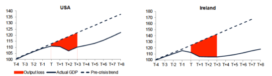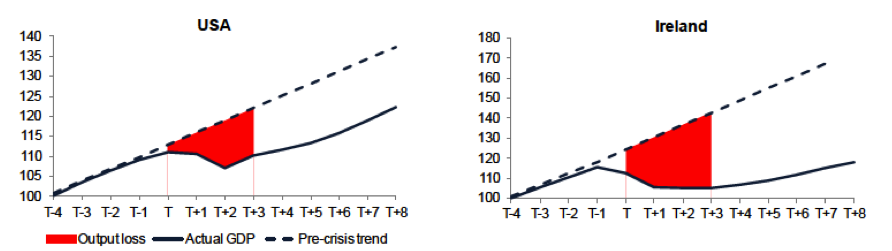 Slika 1: Izgubljen BDP v zadnji bančni krizi v ZDA (2007) in Irski (2008), v % trendnega BDP
