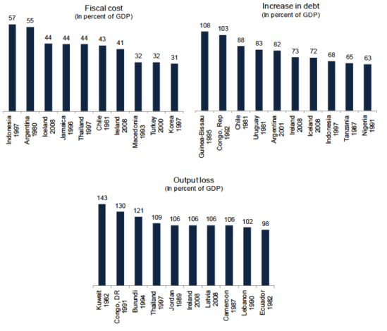 Najdražja bančna kriza v zadnjih štirih desetletjih iz vidika fiskalnih stroškov je bila kriza v Indoneziji (1997), ki je zahtevala reševalni paket vlade v višini 57% BDP. Iz vidika povečanja javnega dolga je bila najdražja kriza v Gvineji-Bissau (1995), ki je povzročila povečanje javnega dolga za 108% BDP. Najdražja bančna kriza iz vidika izgubljenega BDP pa je bila tista v Kuvajtu (1982), ki je državi “odnesla” za 143% BDP. Neslavni rekord pa drži Irska z zadnjo bančno krizo (2008), ki je v vseh treh dimenzijah stroškov med top-10 najdražjimi, in sicer je kriza zahtevala fiskalne stroške v višini 41% BDP, poovečala javni dolg za 73% ter “odnesla” za 106% potencialnega BDP. Glede stroškov zadnje bančne krize se Irski približujeta le Islandija in Latvija (glej sliko 2).