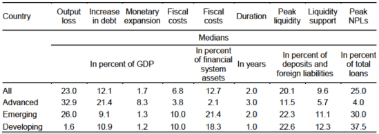 Zgodovinska primerjava stroškov bančnih kriz v obdobju 1970-2011 kaže, da so fiskalni stroški krize v razvitih državah običajno manjši (v povprečju 3.8% BDP) kot v manj razvitih državah (10% BDP), vendar pa so stroški v obliki povečanega dolga (21% BDP) in izgubljenega BDP (33%) v razvitih državah precej višji (glej tabelo 1). Z drugimi besedami, v povprečju je bančna kriza v razvitih državah v zadnjih štirih desetletjih prinesla povečanje javnega dolga za petino in zmanjšanje potencialno dosegljivega BDP za eno tretjino.