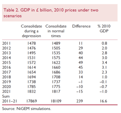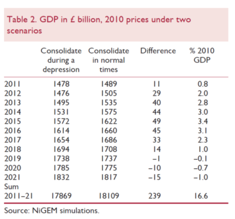 Z namenom, da bi pokazal, koliko Velika Britanija izgublja s fiskalnim postom, je Van Reenen s prilagojenim makroekonomskim modelom NiGEM ocenil razliko v dinamiki rasti BDP z upoštevanjem dveh scenarijev: prvič, z upoštevanjem fiskalne konsolidacije v času depresije, in drugič, z upoštevanjem fiskalne konsolidacije po koncu krize. Kot kažejo rezultati v tabeli, naj bi Velika Britanija do leta 2015 zaradi prestrogega fiskalnega posta letno izgubljala med 0.8% in 3.4 % BDP, pri čemer se letna izguba (razlika med depresijskim in dejansko dosegljivim BDP) močno povečuje. Skupno pa naj bi Velika Britanija v desetih letih zaradi strogega posta izgubila kar šestino BDP (16.6%).