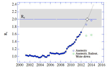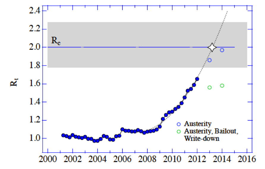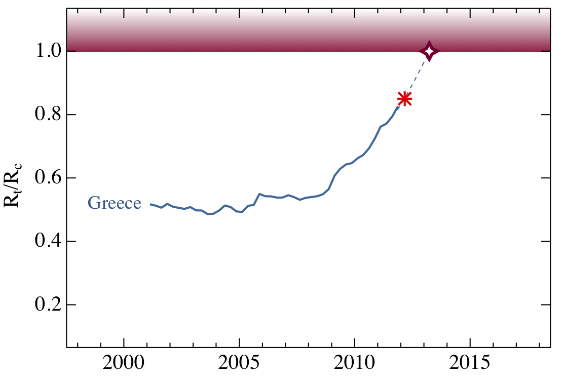 Ker pa so finančni trgi ponoreli že prej (kot bi bilo racionalno glede na evolucijo dolga), je Grčija zaradi nesposobnosti odplačevanja dolga ob tako visokih obrestnih merah de facto polovično bankrotirala že leto prej (marca 2012). S prošnjo za pomoč EU in IMF ter z uvedbo drastičnih varčevalnih ukrepov se je Grčija de iure bankrotu izognila, zaradi česar so obrestne mere spet padle, verjetnost bankrota pa se je bistveno zmanjšala (glej sliko 3; modre prazne točke nakazujejo verjetnost bankrota ob lastnih varčevalnih ukrepih, zelene pa verjetnost bankrota ob varčevalnih ukrepih, finančni pomoči in odpisu dolga).