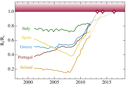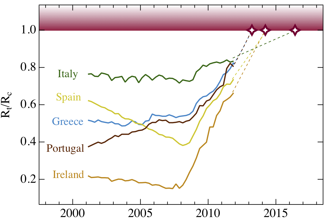 Lagi in Bar-Yam (2012) sta oblikovala model za oceno državnega bankrota, ki temelji na fundamentalnih ekonomskih indikatorjih, predvsem pa na indikatorju javnega dolga glede na BDP. Za večino PIIGS držav dinamika indikatorja zadolženosti dobro napoveduje dinamiko zahtevanih donosov na državne obveznice v obdobju po letu 2001, vse do konca leta 2011. Nato pa so obrestne mere za njihove državne obveznice ponorele. Če bi se trgi še naprej ravnali v skladu z dinamiko dolga glede na BDP (in če bi se dinamika dolga še naprej gibala po isti linearni trajektoriji), bi denimo Grčija morala (polovično) bankrotirati marca 2013 (pri višini dolga 200% BDP), Portugalska tudi marca 2013, Irska aprila 2014, Španija maja 2014, Italija pa julija 2016 (glej slike 1 in 2).