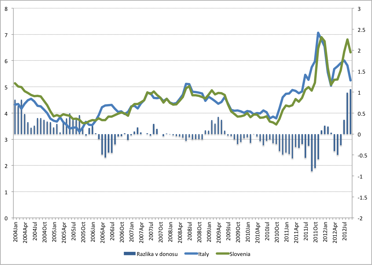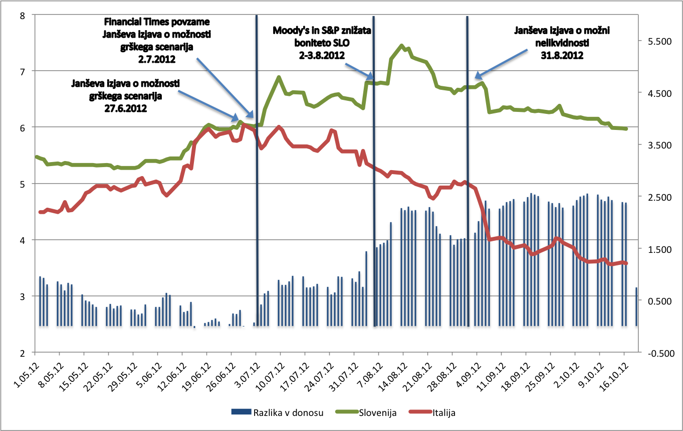 Zahtevan donos na slovenske obveznice se je od italijanskega trajneje odlepil šele v prvih dneh julija letos. Še na zadnji trgovalni dan junija letos sta bila slovenski in italijanski donos praktično poravnana na 6,04%. Takoj prvi teden julija pa je donos slovenskih obveznic močno porastel – do 6. julija 2012 na 6,47%, medtem ko je italijanski donos na isti dan znašal le še 5,79%. Od tukaj naprej pa se je v naslednjih treh mesecih in pol razlika v donosu med obema samo še povečevala – sredi tega tedna že na 2,5 odstotnih točk!
