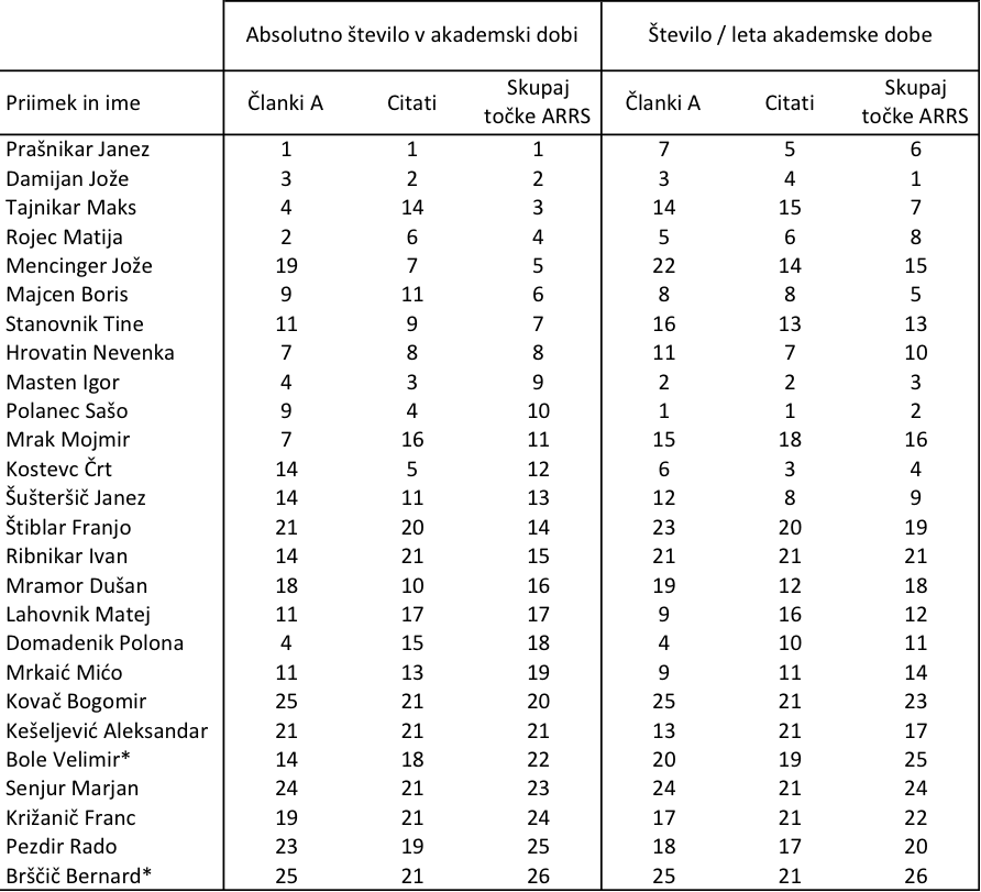Poglejmo, kako se na podlagi metodlogije ARRS odrežejo slovenski ekonomisti v medsebojni primerjavi. Iz baze SICRIS (*) sem zbral “raziskovalne ocene” ARRS za skupino 26 slovenskih ekonomistov. Podatki so zbrani za celotno akademsko dobo raziskovalcev (po doktoratu; razen pri treh izjemah brez doktorata – Bole, Brščič, Pezdir), medtem ko se citati nanašajo samo na zadnjih deset let. Pri tem opozarjam, da nisem zbral podatkov o vseh slovenskih akademskih ekonomistih, pač pa le za skupino, ki se – pogosto ali vsaj občasno – pojavljajo v javnosti in so zaposleni na eni izmed visokošolskih ali raziskovalnih organizacij v Sloveniji.(**) Vključil nisem nekaterih kolegov s področja menedžmenta, informacijskih ved, računovodstva in finančnega menedžmenta. Preprosto iz razloga, ker strogo rečeno niso ekonomisti. Izjemo sem naredil le pri Mateju Lahovniku, ker je bil minister in ker se pogosto pojavlja v javnosti. (Nista pa vključena denimo Mitja Gaspari in Marko Kranjec, ker prvi ni registriran kot raziskovalec, drugi pa ima zgolj tri precej stare domače objave) Seveda sem lahko s tem komu povzročil krivico, ker ga nisem uvrstil v izbor, za kar se že vnaprej opravičujem.