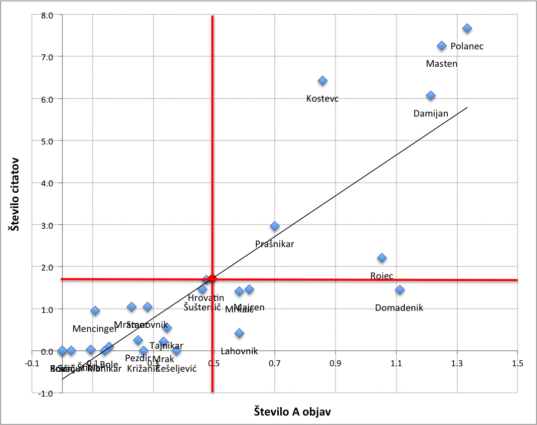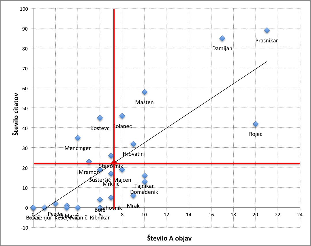 Slika 2: Razvrstitev slovenskih ekonomistov po kriteriju števila A objav in števila citatov (preračunano na leta akademske dobe)
