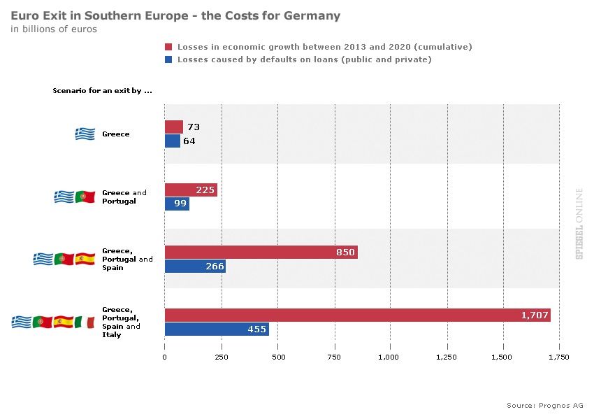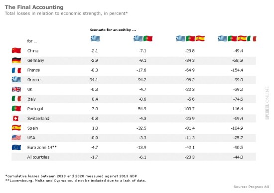 Sinn seveda tudi ne pove, da bi izstop GIPS držav (Grčije, Portugalske, Španije in Italije) iz evro območja povzročil globoko in dolgotrajno recesijo v Evropi in v svetu. Po oceni inštituta Prognos, ki sem jo objavil tudi na tem blogu, bi izstop teh štirih držav povzročil za 17 bilijonov evrov škode. V obdobju 2013-2020 bi se BDP tudi v Nemčiji skrčil skupaj kar za 69% BDP iz leta 2013 glede na potencialno dosegljivega, v Franciji pa denimo kar za 154%. V Grčiji, Španiji in Portugalski pa bi bil izpad BDP med 100% in 116%. Prizadete pa bi bile tudi ZDA (izpad za 26% BDP), še bolj pa Kitajska (izpad skoraj 50% BDP).