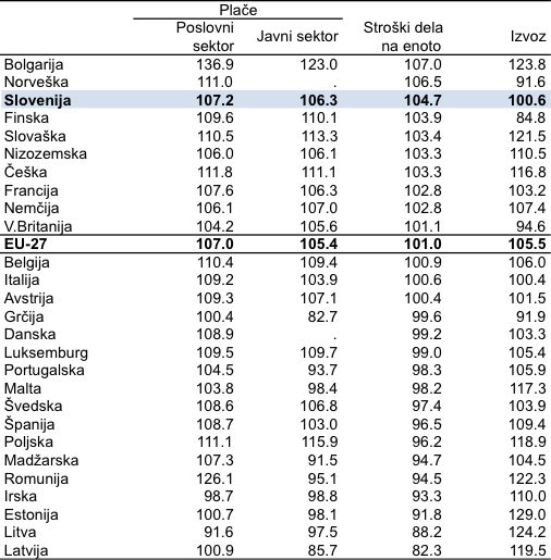 Tabela: Rast plač, stroškov dela na enoto produktivnosti in izvoza v državah EU v obdobju 2008 – 2011 (2008=100)