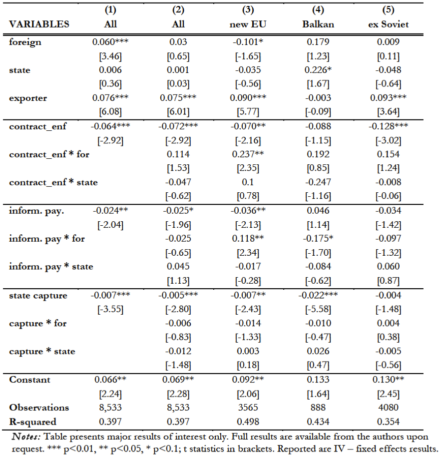 Rezultati raziskave v splošnem pritrjujejo, da nestabilno in koruptivno poslovno okolje negativno vpliva na rast produktivnosti podjetij. Prav tako imajo neformalna plačila in state capture prakse negativen vpliv. Toda znotraj vzorca obstajajo precejšnje razlike med podjetji. Rezultati kažejo, da so tuja podjetja v novih članicah EU, ki so bila vpletena v neformalna plačila, hitreje povečevala produktivnost. Vendar pa je ta učinek izginil po vstopu v EU (po letu 2004), kar nakazuje na izboljšanje  splošnega poslovnega okolja. Na drugi strani pa rezultati kažejo pozitivne koristi od podkupovanja v podjetjih v državni lasti v državah naslednicah nekdanje Sovjetske zveze. Vendar je tudi tukaj ta učinek izginil po letu 2004.