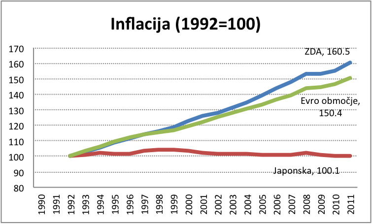 Dinamika splošne ravni cen kaže, da je Japonska kmalu po začetku krize zapadla v deflacijo. Povprečna letna stopnja inflacije na Japonskem v 1990-ih je znašala samo 0.8%, medtem ko je v istem času v ZDA znašala 2.8%, v evro območju pa 2.3%. V zadnjem desetletju pa je Japonska doživljala pravo travmatično deflacijo, saj je bila povprečna letna stopnja inflacije v 2000-ih negativna (-0.3%), v ZDA in evro območju pa je presegala 2% na letni ravni. Leta 2011 je bila tako raven cen na Japonskem enaka kot pred 20 leti, medtem ko je bila v evro območju za 50% višja, v ZDA pa za 60% višja.