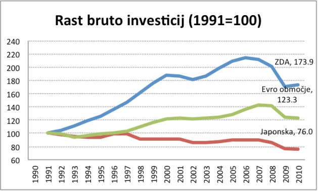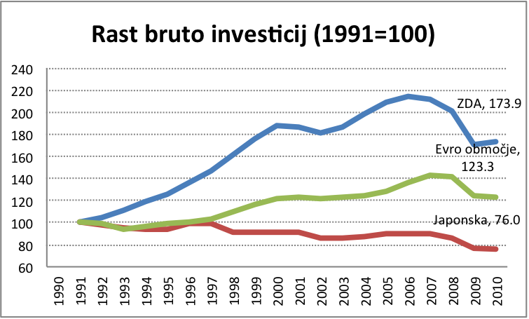 Do konca leta 2010 je bil obseg investicij na Japonskem skoraj za četrtino manjši kot leta 1991. Za primerjavo – v istem času je realni obseg investicij v evro območju porastel za skoraj četrtino, v ZDA pa za dobrih 70%.