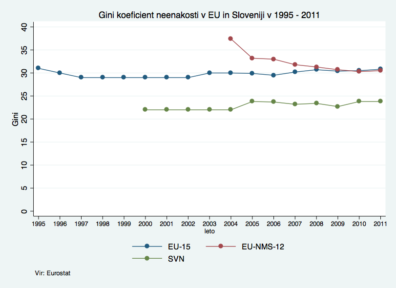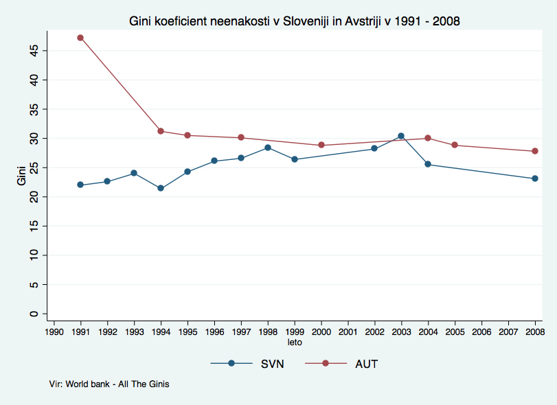 Zgornje podatke sem soočil s standardnim pokazateljem neenakosti – z Ginijevim koeficientom. Gini koeficient je definiran med 0 in 1 (ali 100, če ga izrazimo v %), pri čemer 0 predstavlja popolno enakost (vsi imajo popolnoma enake dohodke – absolutna uravnilovka), 100 pa predstavlja popolno neenakost (ves dohodek je v rokah ene osebe). Po podatkih iz projekta Svetovne banke (All The Ginis) naj bi se neenakost v Sloveniji po letu 1991 nekoliko povečala, in sicer iz 22 na 30 Ginijevih točk, nato pa se po letu 2003 spet zmanjšala na 23. V istem času se je neenakost v Avstriji dramatično zmanjšala – iz 47 na na 28 Ginijevih točk.
