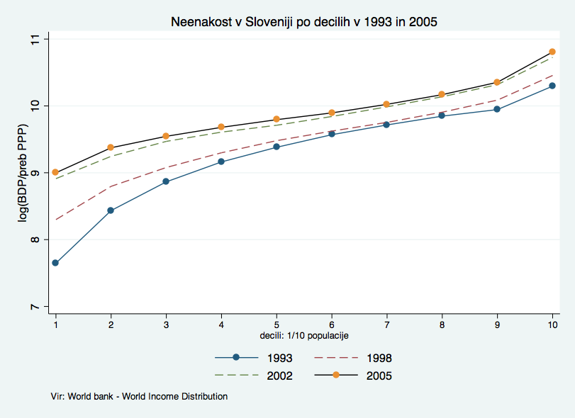Kaj pa Slovenija? Kaj se dogaja z neenakostjo pri nas? Se je povečala ali zmanjšala? Kakšna je glede na druge države? Poglejmo najprej časovno dinamiko porazdelitve dohodkov. Zaradi medčasovne primerjave sem podatke Svetovne banke preračunal na decile ter uporabil korekcijski faktor za leto 1993, tako da lahko primerjam porazdelitev dohodkov v štirih obdobjih, za katera so dostopni podatki: 1993, 1998, 2002 in 2005. Slika kaže zanimivo situacijo: kaže namreč na kompresijo dohodkov po letu 1993. Ali drugače povedano, dohodki v najnižjih decilih (najbolj v prvih treh) so se po letu 1993 povečali relativno glede na ostale skupine prebivalstva, kar nakazuje na zmanjšanje dohodkovne neenakosti. Na drugem koncu distribucije pa so se dohodki v najvišjih dveh decilih relativno povečali. Preprosto povedano: “revnejši” sloji naj bi se bolj približali povprečju, medtem ko so najbolj “bogati” še malce povečali svojo prednost pred ostalimi.