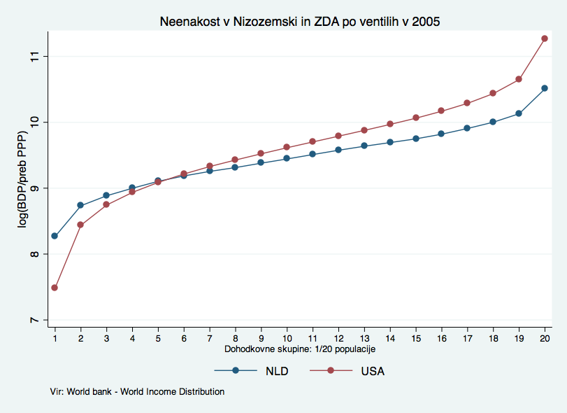 Dani Rodrik (Harvard) je pred kratkim na blogu naredil drobno vajo v slogu, da bi pokazal, če so Američani na boljšem kot denimo Nizozemci. Vzel je podatke Svetovne banke (WYD – World Income Distribution, projekt, za katerega pridno skrbi Branko Milanovic) o distribuciji dohodkov Američanov in Nizozemcev po ventilih (20 dohodkovnih razredov, širokih po 5% prebivalstva). Dobil je takšno sliko: