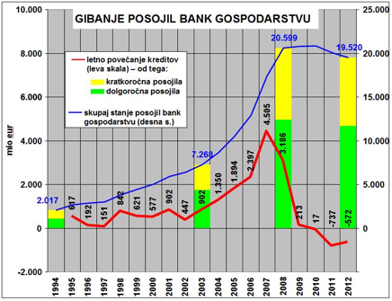 Na spodnjem grafikonu je z rdečo linijo prikazan letni prirast odobrenih posojil gospodarstvu od bank s sedežem v Sloveniji (domačih in tujih), z modro pa stanje teh posojil konec posameznega leta (desna skala). Do leta 2004 so tako banke vsako leto povečale skupni znesek posojil v povprečju za okoli 500 milijonov evrov. Ker je bila začetno stanje odobrenih posojil nizko (2 milijardi evrov), je to vseeno pomenilo povprečno 15 % letno rast. V vseh navedenih devetih letih do leta 2004 so tako banke svojo izpostavljenost do gospodarstva povečale za dobrih 5 milijard evrov.
