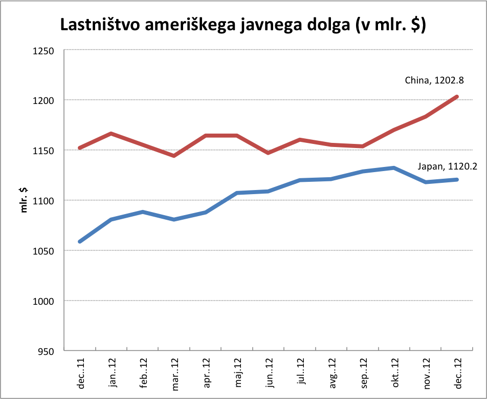Zaenkrat strah pred nobenim izmed obojega (še) ni upravičen. Boj proti strahu je najbolj učinkovit, če posežemo po dejstvih in številkah. Poglejmo najprej kratkoročne trende. Po podatkih ameriškega finančnega ministrstva je denimo do junija 2012 Kitajska zmanjšala svoj delež imetij v ameriških vrednostnih papirjih za 7.5%. Toda na drugi strani je Japonska v istem času povečala svoj delež imetij za skoraj 13%. Analitiki so predvidevali, da bo s postopnim umikom Kitajske že sredi leta 2013 največji imetnik ameriških obveznic postala Japonska. Toda v drugi polovici leta 2012 se je trend spet obrnil, Japonska je do decembra 2012 ohranila enak obseg imetij ameriškega dolga (na ravni 1,12 bilijona dolarjev) kot sredi leta, medtem ko ga je Kitajska spet povečala za 50 milijard dolarjev (na 1,20 bilijona dolarjev).