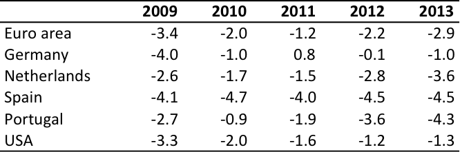 Na drugi strani pa se je strukturni deficit v EU (proračunski saldo, očiščen konjunkturnih vplivov) v istem času izboljšal (iz -3.6% v 2011 na -1.3% v 2013), kar pomeni, da je fiskalna stabilizacija šla na škodo gospodarske rasti. Ali z drugimi besedami, prezgodnja fiskalna konsolidacija nas je pripeljala nazaj v krizo: