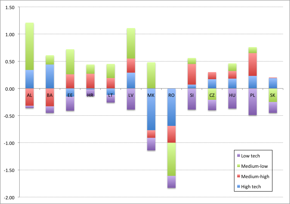 Ali drugače povedano, Slovenija ni naredila tehnološkega preboja. Delež izvoza visokotehnoloških panog v celotnem izvozu v Sloveniji je bil leta 2011 zgolj 5.8%, na Češkem 14.8%, na Slovaškem 18.7%, v Madžarski pa denimo 19.7%. Slovenija se je glede izvoznega prestrukturiranja tako obnašala bolj kot manj napredne CEE države, zato smo jo v raziskavi morali uvrstiti v skupino z denimo Bolgarijo, Romunijo in baltskimi državami, ne pa v skupino z bolj naprednimi državami (Češka, Madžarska, Slovaška, Poljska). Izrivanje oziroma nedopuščanje tujega kapitala se nam torej ni nujno splačalo.