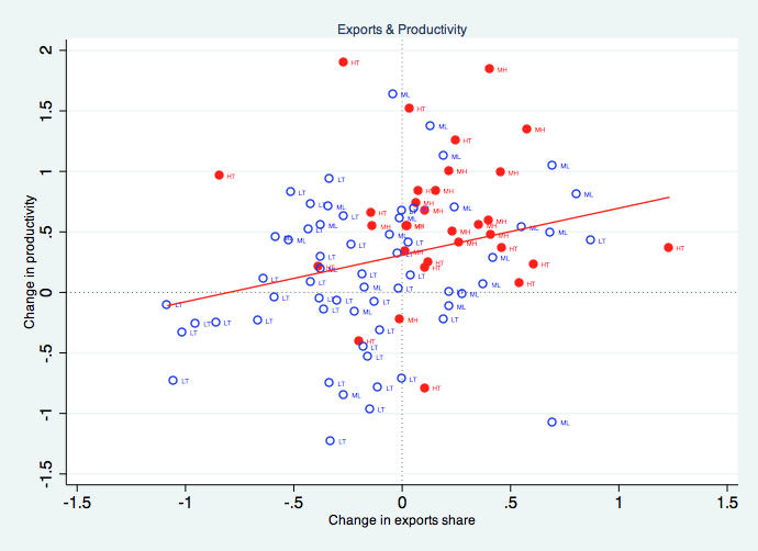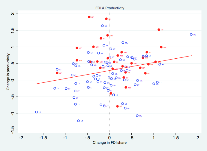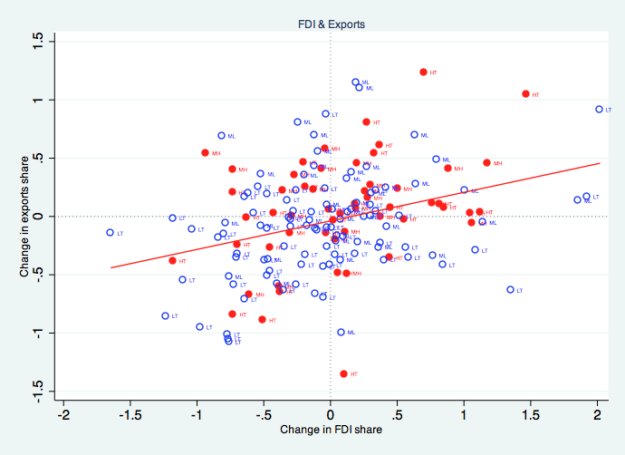 V sliki 1, ki kaže dolgoročne spremembe v obdobju 1995-2007 v deležu panog v celotnem pritoku NTI in deležu panog v celotnem izvozu, bodite pozorni na barve: modra barva označuje panoge z nizko (LT) in srednje-nizko tehnologijo (ML), rdeča barva pa panoge s srednje-visoko (MH) in visoko tehnologijo (HT). Povezava med rastjo NTI in izvoza je pozitivna in očitno je, da so panoge – ne glede na raven tehnologije – s pritokom tujih investicij in z vključitvijo v globalne ponudbene verige multinacionalk pridobile in uspešno povečale izvoz. Več kot je bilo investiranega tujega kapitala, večja je bila korist v obliki povečanja izvoza.