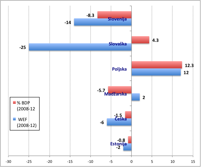 Podobne so razmere v drugih državah konkurentkah Slovenije med novimi članicami EU. Pri vseh razen pri dveh izjemah (Slovaška in Madžarska) je očitna povezava med gospodarsko rastjo in dinamiko konkurenčnosti v zadnjih petih letih. Denimo: Slovenija je na lestvici WEF v obdobju 2008-2012 izgubila skupaj 14 mest in obenem utrpela kumulativni padec BDP za nekaj več kot osem odstotkov. Pozitiven primer je Poljska, kjer je v obdobju 2008-2012 BDP zrasel skupno za nekaj več kot 12 odstotkov, hkrati pa se je Poljska konkurenčnost na lestvici WEF dvignila za 12 mest. Na drugi strani je med izjemami zanimiv primer Slovaške, katere konkurenčnost je kljub porastu BDP za nekaj več kot štiri odstotke upadla kar za 25 mest. Glavne težave Slovaške se nanašajo na politično nestabilnost, menjave vlad ter na odpravo oziroma omilitev nekdanjih uspešnih reformih ukrepov na področju davkov (odprava enotne davčne stopnje) in trga dela. Toda Slovaška je s svojimi reformami v letih 2004-2005 uspela privabiti tuja podjetja, ki danes kljub politični nestabilnosti zagotavljajo robustno rast in stabilnost slovaškega gospodarstva.