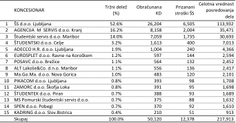 Kot vidimo, je trg posredovanja študentskega dela skrajno nenavaden in asimetričen – tipična Paretova distribucija z zelo dolgim repom. En koncesionar (ŠS Ljubljana d.o.o. – e-študentski servis) ima kar 52% trga, trije največji skupaj pa zasedajo več kot 82% trga. Ostalih 40 pa ima skupaj manj kot 18 % trga. Največji med majhnimi koncesionarji dosega vsega 3.2 %. Povprečni tržni delež med majhnimi koncesionarji je 0.44 % in v povprečju manjši koncesionar za svoje poslovanje letno dobi manj kot 55 tisoč evrov priznanih stroškov.