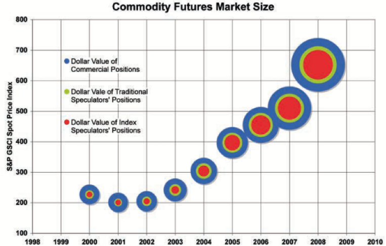 Pri tem izstopajo vlagatelji v indekse dobrin (najbolj znana sta S&P GSCI in Dow Jones-UBS CI), saj se od običajnih špekulantov razlikujejo v tem, da ne doprinašajo likvidnosti na trg, da niso občutljivi na cene in da kupujejo samo dolge pozicije (po klasifikaciji CFTC naj bi običajni in indeksni špekulanti zavzemali okoli 80 % trgovanja).