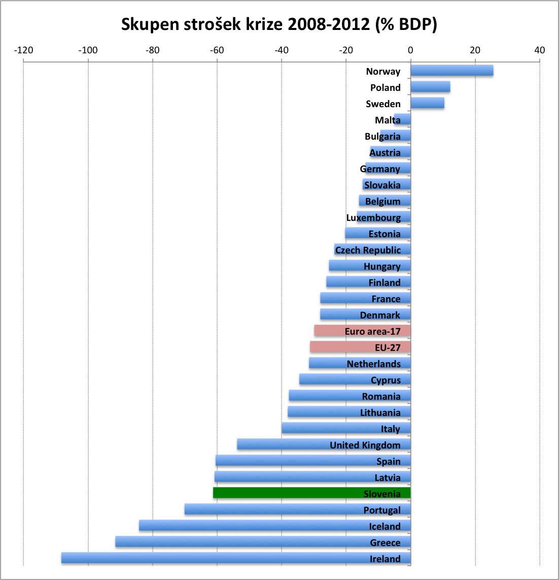 Če vse tri elemente stroškov krize seštejemo, je Slovenijo kriza do sedaj stala že dobrih 60% BDP. Ali z drugimi besedami: kriza je do sedaj Sloveniji odnesla že za skoraj 22 milijard evrov! Slovenija je po skupnem strošku krize na neslavnem petem mestu med 29 najbolj razvitimi evropskimi državami. Ni najslabša, saj je kriza Irski odnesla že za 108% BDP, Grčiji za 92% BDP, Islandiji pa za 84% BDP. Toda krize še zdaleč ni konec. Irska in Islandija sta krizo začele reševati zelo hitro, že septembra 2008 sta začeli s sanacijo bank, Slovenija pa bo s tem začela šele letos jeseni. Zato bo končni strošek krize za Slovenijo še bistveno višji – tako iz vidika izgubljenega BDP v naslednjih letih kot iz vidika dodatnih (še skritih) stroškov sanacije bank. Ta visok strošek pa je v veliki meri posledica prepočasnega in napačnega pristopa k reševanju krize, kjer največja krivda bremeni Pahorjevo vlado.