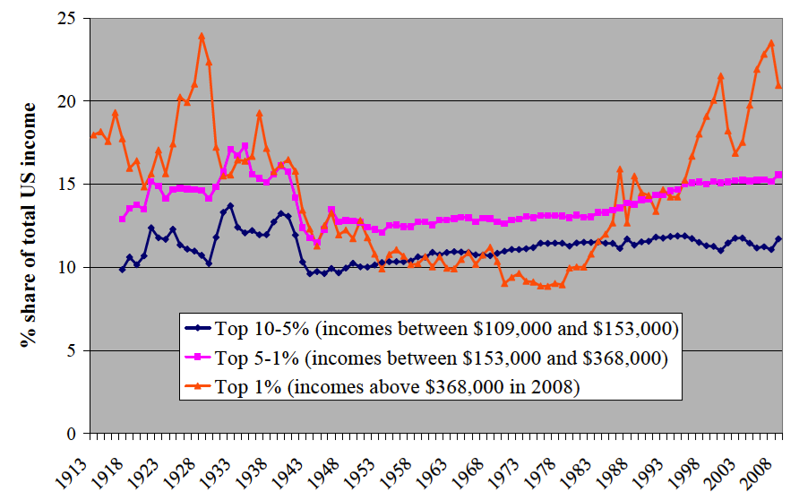 Trije najvišji dohodkovni razredi kot odstotek celotnega dohodka ZDA v obdobju 1913 – 2008