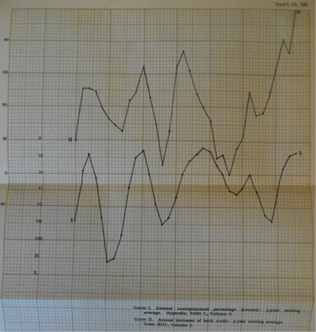 Vendar je Pigou malo pred veliko depresijo (1927) razvil monetarno teorijo, ki je predvidevala, da če nivo zasebnega dolga strmo pade, potegne gospodarstvo s seboj. Pri tem je jasno ločil med sposojanjem pri drugih ljudeh in med sposojanjem v banki. Prvo pomeni prenos obstoječe kupne moči od ene osebe do druge. Slednje pa pomeni ustvarjanje nove kupne moči. Pigou je zato pričakoval močno korelacijo med posojanjem bank in ekonomsko aktivnostjo. Spodnji Pigoujev graf I prikazuje odstotek nezaposlenosti (obrnjeno), graf II pa prikazuje letno povečanje bančnega kredita.