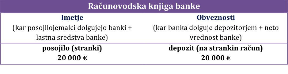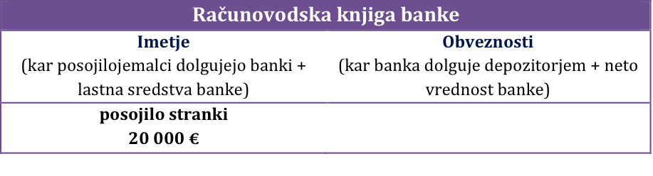 Če proces dejanskega ustvarjanja denarja pokažemo še shematično s preprosto računovodsko knjigo banke, zgleda takole: