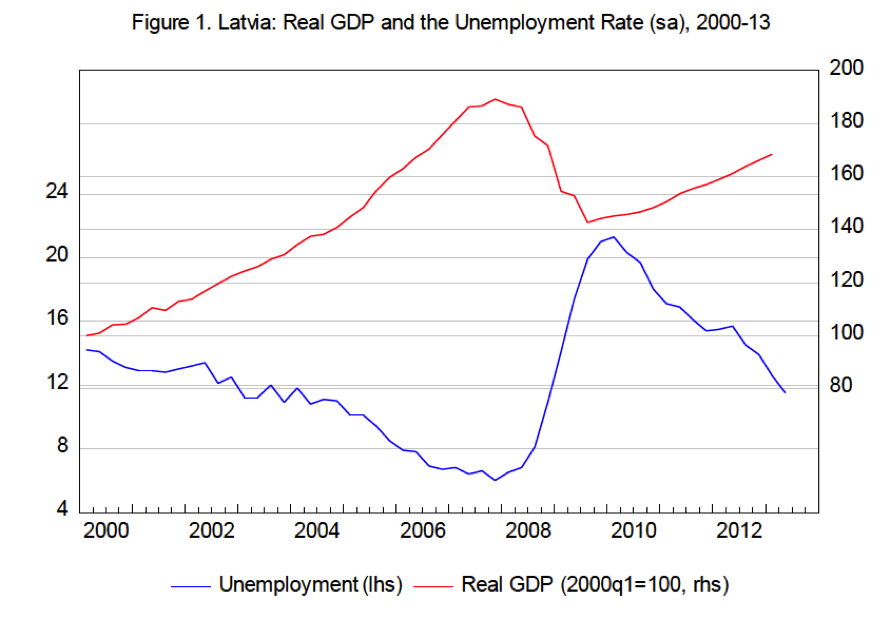 Prejšnji četrtek in petek je potekal tradicionalni Fall 2013 Brookings Panel on Economic Activity, na katerem je največ pozornosti požela predstavitev članka o latvijski poti iz krize Boom, Bust, Recovery: Forensics of the Latvia Crisis, pod avtorstvom Oliviera Blancharda, glavnega ekonomista IMF ter njegovih kolegov Griffithsa in Grussa, prav tako iz IMF. 21. oktobra bo na Dunaju konferenca avstrijske centralne banke 74th East Jour Fixe of the Oesterreichische Nationalbank, ki bo v celoti posvečena gospodarski situaciji v Latviji. Kako to, da je Latvija nenadoma pod sojem (raziskovalnih) žarometov? Razlog je v tem, da je Latvija ob začetku krize doživela dramatični padec BDP za več kot 20%, nato pa se je relativno hitro začela vzpenjati nazaj, kar so zagovorniki ostre politike varčevanja (austerity) proglasili kot model, kako dobro politika varčevanja deluje.