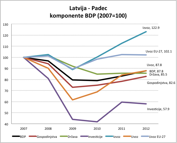 Latvija po letu 2010 robustno raste, večinoma po zaslugi izvoza, medtem ko zasebna potrošnja le malenkostno raste, državna pa rahlo upada. Toda konec lanskega leta je bil – kljub za 23% večjemu izvozu glede na 2007 – latvijski BDP še vedno za 12% nižji kot pred krizo. Vendar bo s to dinamiko rasti Latvija v 2 – 3 letih nadoknadila izgubljeno.
