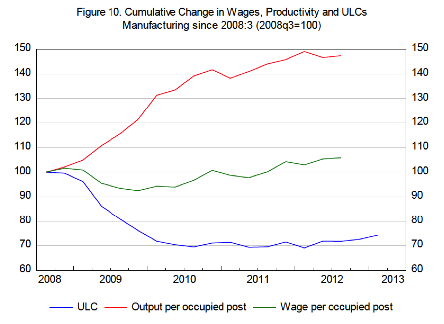 Gospodarska rast se je povrnila v drugi polovici leta 2010, večinoma zaradi hitre rasti izvoza, medtem ko je domače povpraševanje počasi okrevalo. Rast izvoza je bila v veliki meri posledica povečanja konkurenčnosti latvijskega gospodarstva. Do te pa, kot rečeno, ni prišlo zaradi zunanje devalvacije, pač pa zaradi notranje – prek znižanja inflacije in stroškov dela. Pri tem je zanimivo, da stroški dela niso padli zaradi nominalnega znižanja plač. Namreč plače v zasebnem sektorju niso sledile znižanju plač v javnem sektorju, ampak so ostale na podobni ravni kot prej. Stroški dela (na enoto) v zasebnem sektorju so padli, vendar se večinoma niso znižali prek znižanja plač, pač pa prek dviga produktivnosti (glej sliko spodaj). Produktivnost, ki se meri kot output na zaposlenega, pa je (seveda) narasla primarno zaradi enormnega znižanja zaposlenosti … ter emigracije v tujino.