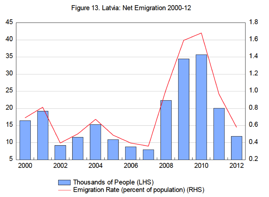 In v tem je eden ključnih misterijev latvijskega ponovnega vzpona iz pepela. Odgovor je v spodnji sliki, ki kaže velik odliv predvsem mlade delovne sile po izbruhu krize. V petih letih po izbruhu krize je Latvijo zapustilo 125,000 prebivalcev oziroma 6% celotnega prebivalstva oziroma okrog 12% celotne delovne sile. Tovrstni migracijski valovi so značilni predvsem za ZDA, medtem ko so v Evropi popolni unikum. Na ta način je Latviji uspelo dvigniti produktivnost, hkrati pa se izogniti še večji brezposelnosti (ki bi bila sicer za okrog 6 odstotnih točk višja).