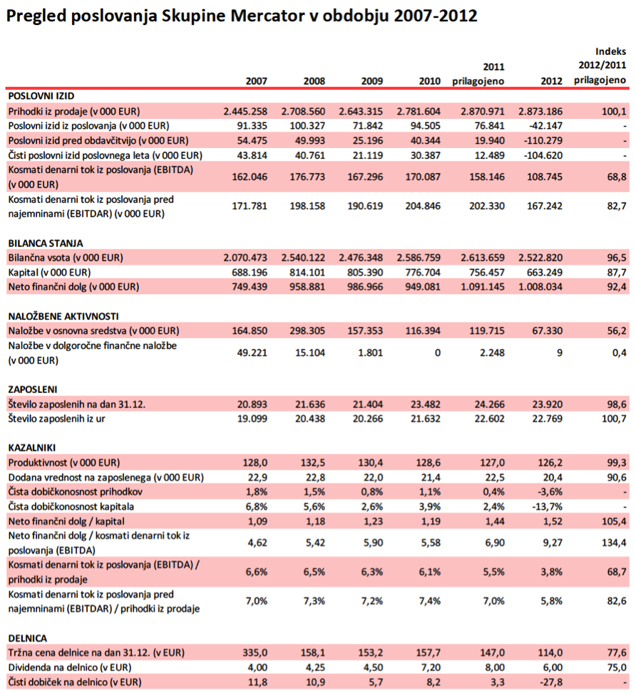 Zakaj nihče drug ni pokazal interesa za Mercator? Iz preprostega razloga – pogledali so si številke. Po eni strani velikost trga, kjer je Mercator prisoten in možnost sinergij z lastno trgovsko verigo, po drugi strani pa bilance Mercatorja. Leta 2010 je imel Mercator razmerje med neto finančnim dolgom in denarnim tokom (EBITDA) v višini 5.6, kar po domače pomeni, da bi lahko z lastnim čistim prihodkom poplačal svoj dolg v nekoliko manj kot v šestih letih, če ne bi nič investiral. Toda v finančnem svetu se, ko se razmerje dolga glede na EBITDA približa količniku 4 do 5, prižgejo alarmi, da je podjetje prezadolženo in da je ogrožena njegova sposobnost poplačila kreditov. Za primerjavo, v istem času je pri Agrokorju ta količnik znašal samo 3.9 (v posojilnih pogodbah s tujimi kreditodajalci ima klavzulo, da neto finančni dolg ne sme preseči 4-kratnika EBITDA).