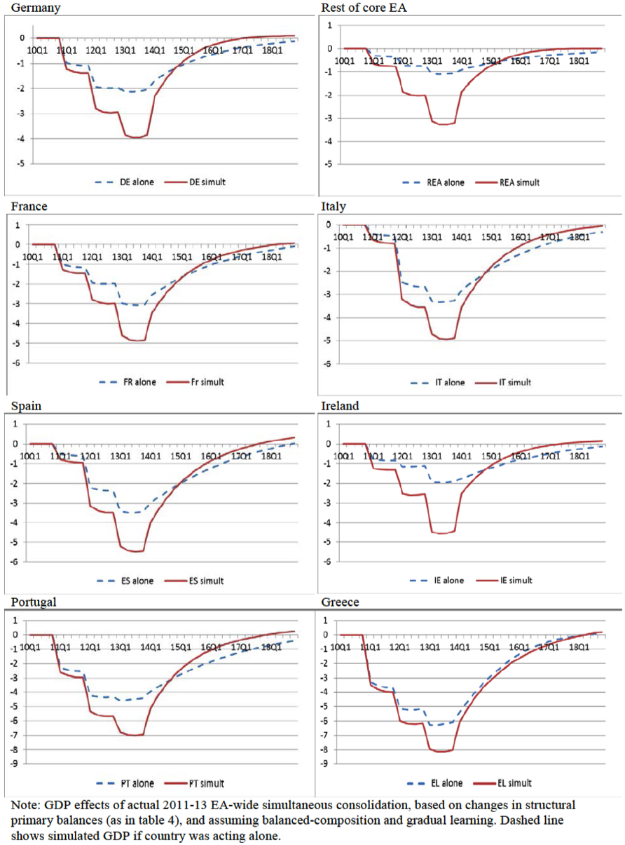Spodnja slika kaže učinke na BDP hkratnega varčevanja vseh članic brez in ob upoštevanju spillover učinkov. Kot lahko vidite je s tem lastnim in hkratnim varčevanjem vseh članic prizadeta tudi Nemčija (čeprav najmanj). Najbolj negativni učinki so v najmanjših članicah.