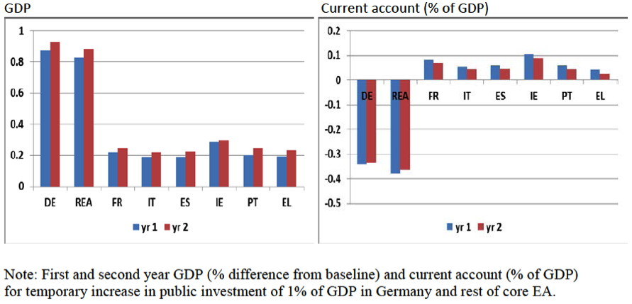 Zato Jan in ‘t Veld kot enega izmed ukrepov simulira tudi, da jedrne države (Nemčija) namesto fiskalnega varčevanja zaženejo fiskalno trošenje in s tem posredno pomagajo rasti ostalim članicam evro območja. Rezultati kažejo, da bi nemško povečanje javnih izdatkov za 1% BDP v ostalih članicah na letni ravni vplivalo na povečanje BDP v višini med 0.2% in 0.3% BDP. Imelo pa bi tudi učinek na izboljšanje tekočega računa plačilne bilance v ostalih državah (med 0.05% in 0.1% na letni ravni).