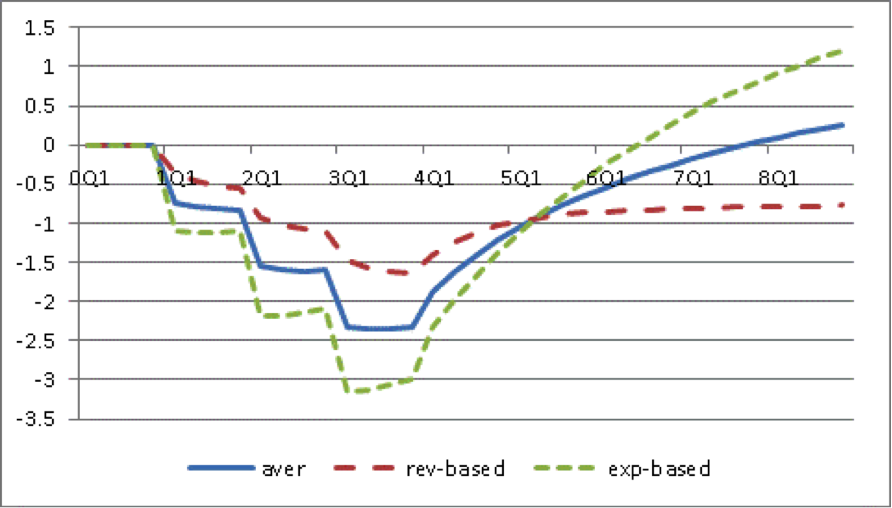 Raziskava ugotavlja, da ima fiskalna konsolidacija na strani izdatkov večje multiplikativne učinke kot konsolidacija na strani fiskalnih prihodkov. Denimo za Španijo znaša ocenjen fiskalni multiplikator na strani izdatkov 1.1, na strani prihodkov pa 0.5, medtem ko ima uravnotežena fiskalna konsolidacija multiplikativni učinek v višini 0.8. Preprosto rečeno, letno znižanje javnih izdatkov za 1% BDP zmanjša tekoči BDP za 1.1%, povečanje davkov za 1% BDP pa zniža tekoči BDP za 0.5%. Vendar pa se ti učinki fiskalne konsolidacije (znižanje deficita vsako leto za 1% BDP v obdobju treh let) seveda kumulativno nalagajo (tretje leto znašajo že skupaj 3 BDP), kar seveda ustrezno povečuje kumulativni učinek na gospodarsko aktivnost v naslednjih letih (glej sliko 1 spodaj). Skupen (kumulativni) učinek fiskalne konsolidacije za Španijo v obdobju sedmih let po začetku konsolidacije tako v primeru konsolidacije na strani prihodkov znaša -6.8% zmanjšanje BDP, v primeru konsolidacije na strani izdatkov pa -8.3 % zmanjšanje BDP. Uravnotežena konsolidacija pa bi BDP v sedmih letih znižala za 7.6%.