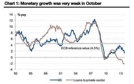 Zadnji podatki kažejo, da se deflacija v evro območju razrašča. Po oktobrski nizki (letni) rasti cen (samo 0.7%, cilj ECB pa je “blizu” 2%), pa je bolj zaskrbljujoč trendno upadanje rasti količine denarja v obtoku (oktobra le še 1.4%, cilj ECB je 4.5%) ter absolutno upadanje kreditne aktivnosti bank.