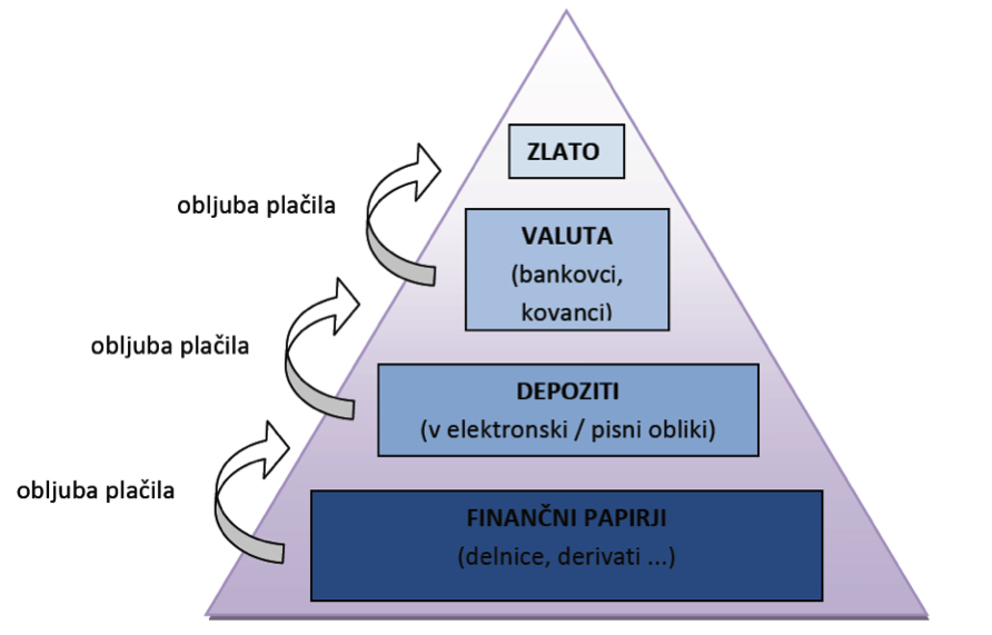Slika 1: Preprosta hierarhija denarja v sistemu zlatega standarda (povzeto po Mehrling)
